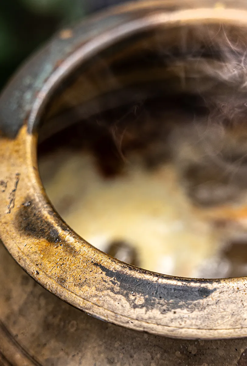 Take a deep, heavy bottomed pot. The farmers use an earthen pot or a narrow mouthed brass pot. Add 200g of deshelled split moong daal and a combination of chana daal, arhar daal and deshelled urad daal made up to 200g.